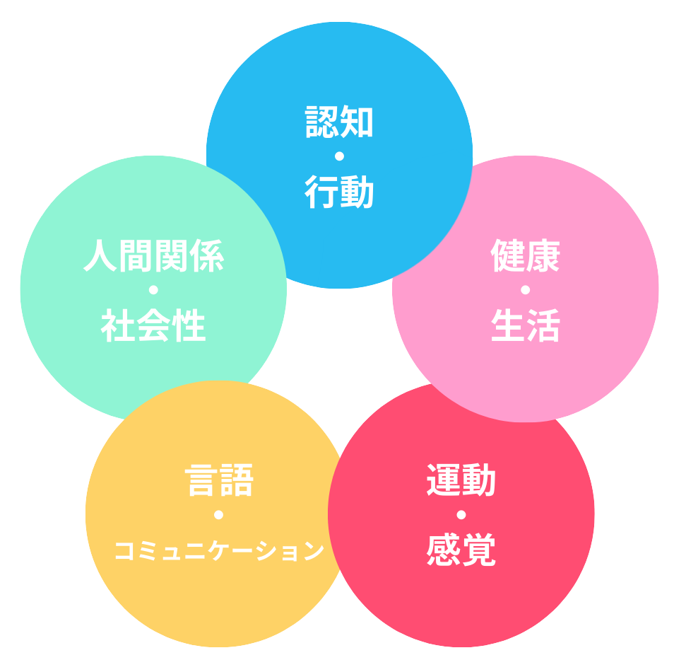 療育内容は、子どもが将来、日常生活や社会生活を円滑に営めるようにするために行うものであり、具体的な支援は「認知・行動」「人間関係・社会性」「言語・コミュニケーション」「運動・感覚」「健康・生活」の5領域になります。
